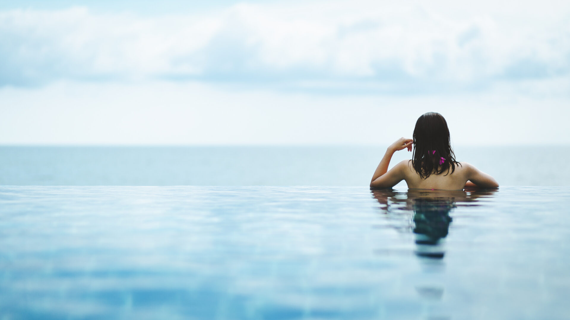 Summer vacation concept, Asian woman relax in pool hotel resort with sea beach background at Chanthaburi, Thailand